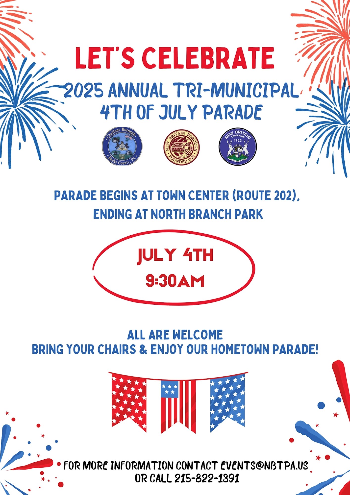 Tri-Municipal Fourth of July Parade starts at 9:30 AM at the Town Center Shopping Center in New Britain Borough. Parade follows route along Butler Avenue into Chalfont Borough, turning right on N. Main Street, then turning right on Park Avenue and follows route along to its destination at North Branch Park in New Britain Township. Affected roads will be closed.