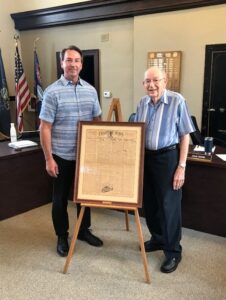 Below is an image of (now former) Mayor Brian Wallace, accepting on the Borough’s behalf (by Resolution 2021-04), the gifted April 1, 1931 Chalfont News publication from Mr. Everett Wick on August 9, 2021.